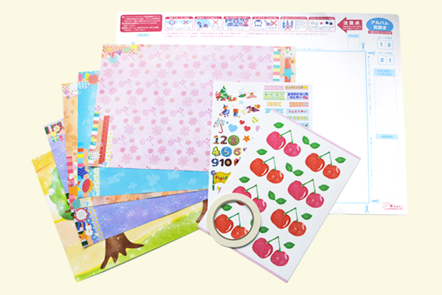 台紙・切り貼り応援セット(両面テープ・バックデザインシート・コメントシート)が入っています。
