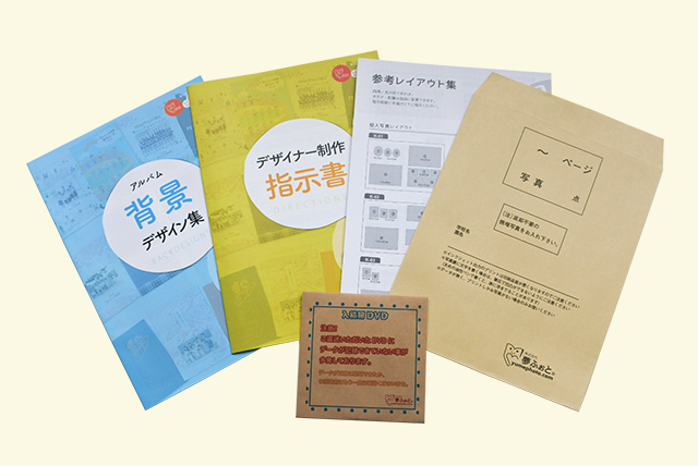 バックデザイン集・参考レイアウト集・指示用紙・入稿用CD(又はDVD)・写真袋が入っています。