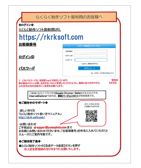 お客様番号・ログインID・パスワードは、「らくらく制作ソフト御利用のお客様へ」と書かれたA4サイズの資料(下記参照)、またはメールの案内に記載しています。