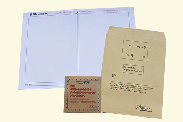 見返し指示用紙・入稿用CD(又はDVD)・写真袋が入っています。