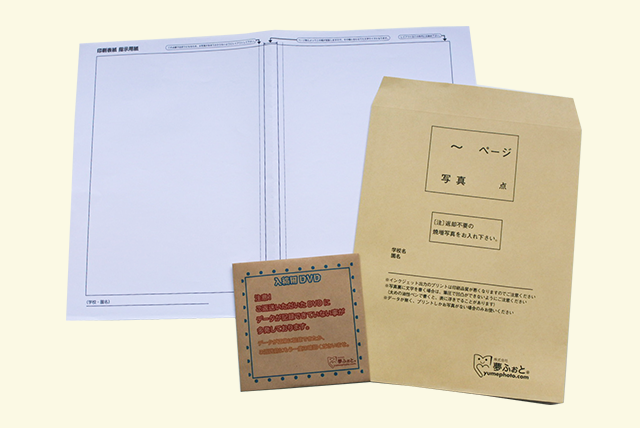 印刷表紙指示用紙・入稿用CD(又はDVD)・写真袋が入っています。お写真のデータが無い場合は写真袋にプリント写真を入れてご入稿ください。