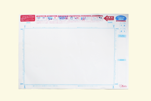台紙の太い水色の内側3ミリにある薄い水色の部分(はさみマークのライン)で裁断されます。デザインシートは枠いっぱいに貼り、写真は断ち切り線の内側に貼ってください。